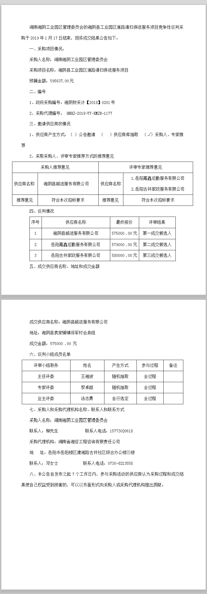 湘陰縣工業(yè)園區(qū)道路清掃保潔服務(wù)項(xiàng)目 競爭性談判成交結(jié)果公告