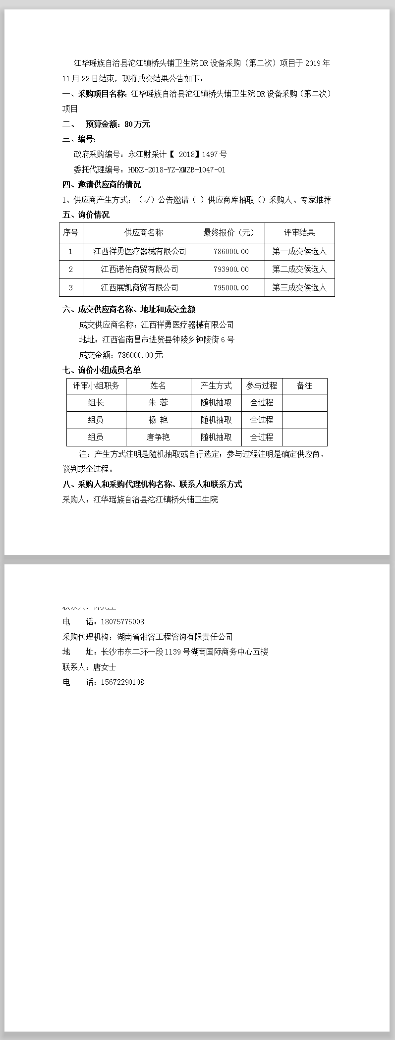 江華瑤族自治縣沱江鎮(zhèn)橋頭鋪衛(wèi)生院  DR設(shè)備采購(gòu)(第二次)成交結(jié)果公告