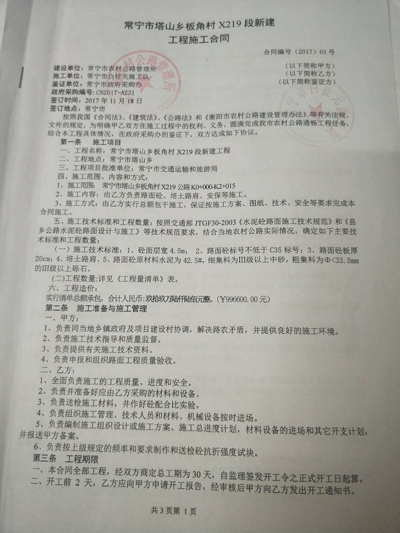 常寧市塔山鄉(xiāng)板角村X219段新建工程合同公示