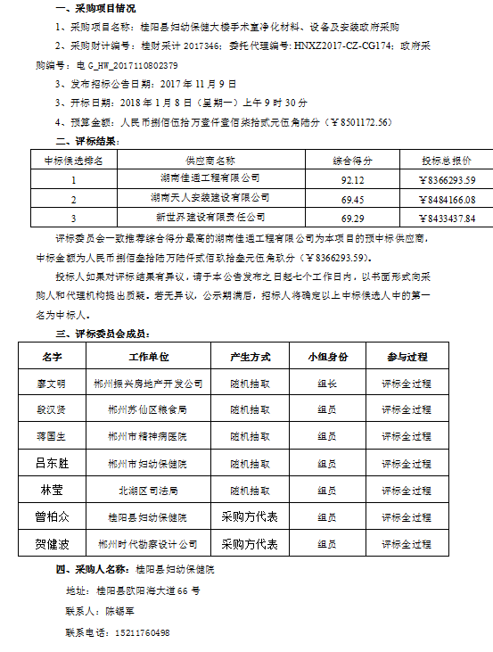 桂陽縣婦幼保健大樓手術(shù)室凈化材料、設(shè)備及安裝政府采購 評標結(jié)果公示