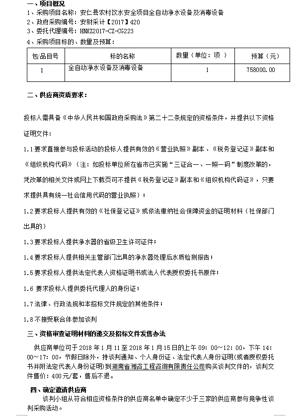 安仁縣農(nóng)村飲水安全項目全自動凈水設(shè)備及消毒設(shè)備談判公告