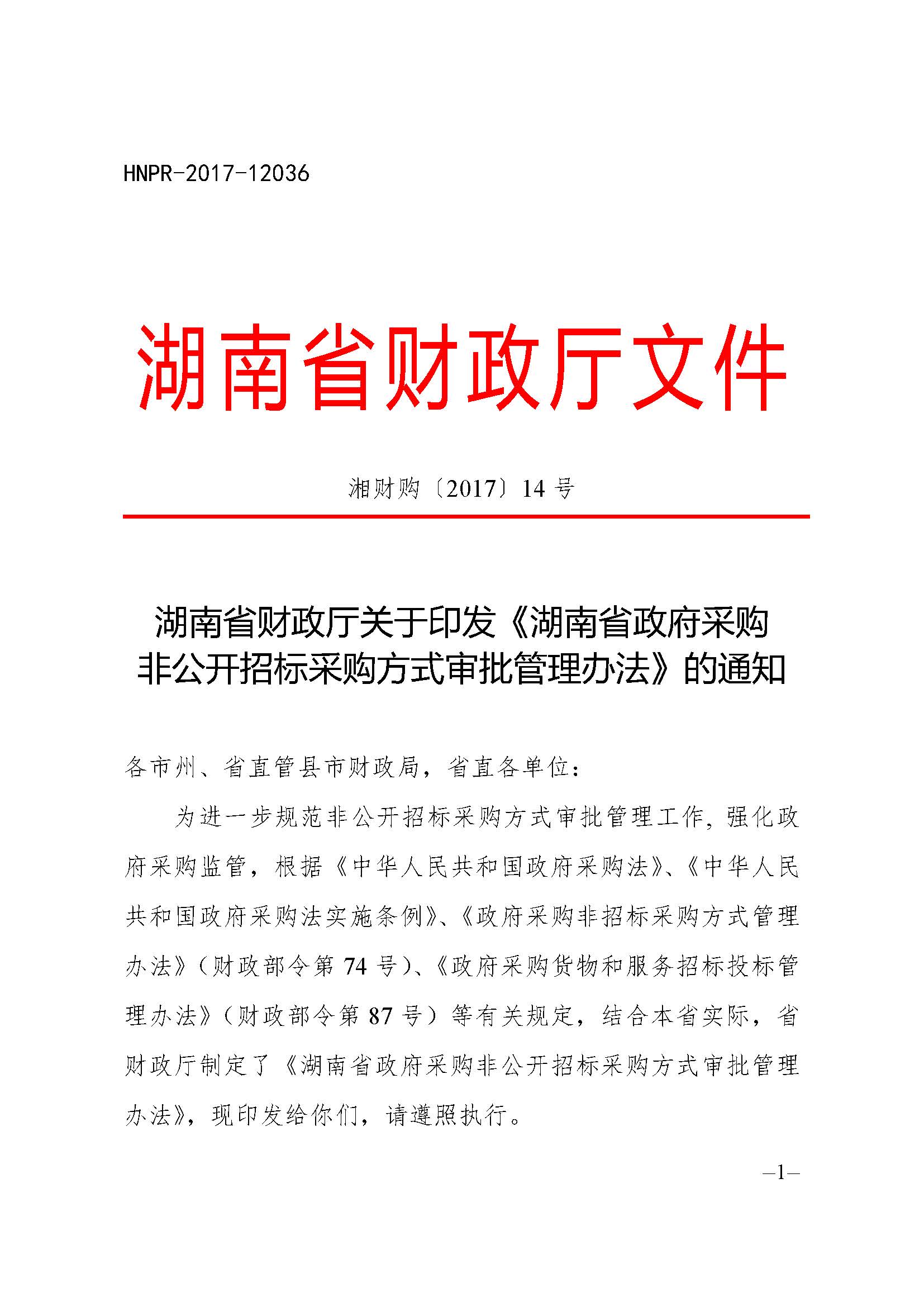 湖南省財(cái)政廳關(guān)于印發(fā)《湖南省政府采購(gòu) 非公開(kāi)招標(biāo)采購(gòu)方式審批管理辦法》的通知