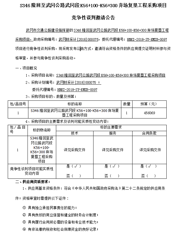 S346隆回至武岡公路武岡段K56+100-K56+300棄場復(fù)墾工程采購項目 競爭性談判邀請公告