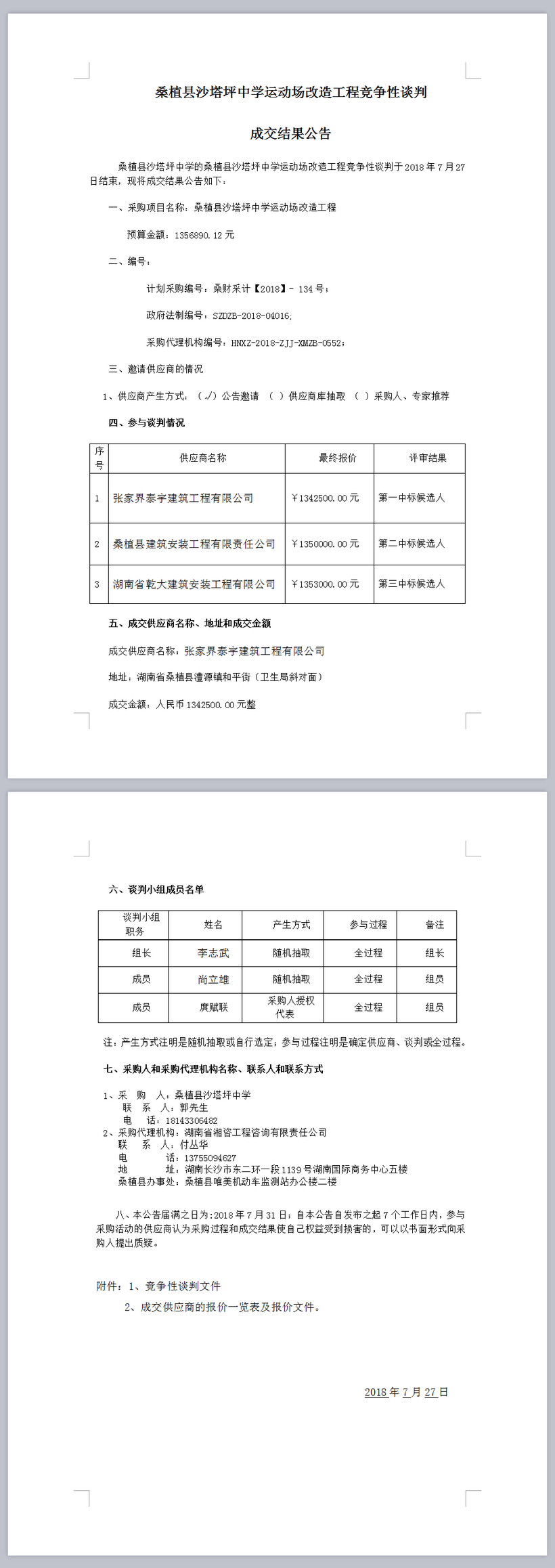 桑植縣沙塔坪中學(xué)運(yùn)動(dòng)場(chǎng)改造工程談判成交公告