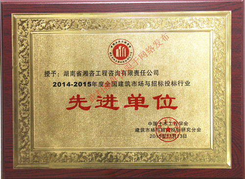 【喜訊】熱烈慶祝我司榮獲2014-2015年全國建筑市場(chǎng)與招標(biāo)投標(biāo)行業(yè)先進(jìn)單位