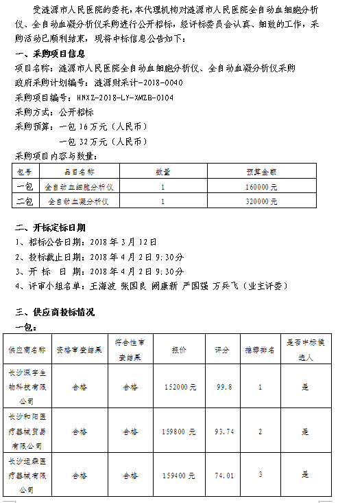 漣源市人民醫(yī)院全自動(dòng)血細(xì)胞分析儀、全自動(dòng)血凝分析儀采購(gòu)中標(biāo)結(jié)果公告