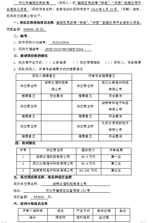 鶴城區(qū)民政局“扶老”、“濟困”數(shù)據(jù)應用平臺信息化項目成交公告