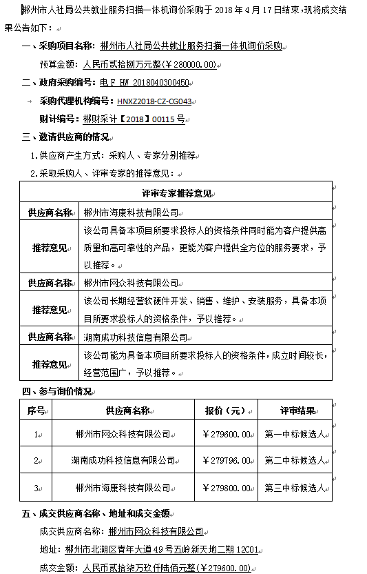 郴州市人社局公共就業(yè)服務(wù)掃描一體機詢價采購成交結(jié)果公告