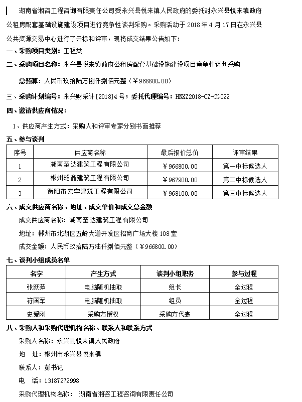 永興縣悅來鎮(zhèn)政府公租房配套基礎設施建設項目競爭性談判采購成交公告