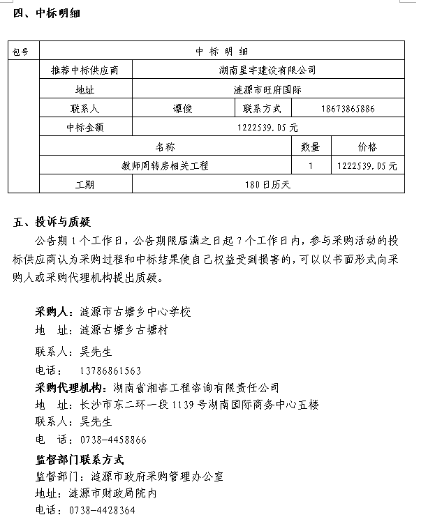 漣源市古塘小學(xué)教師周轉(zhuǎn)房建設(shè)項(xiàng)目采購中標(biāo)結(jié)果公告