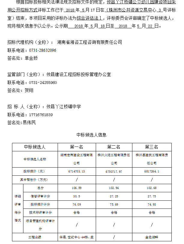 攸縣丫江橋鎮(zhèn)公立幼兒園建設(shè)項(xiàng)目招標(biāo)投標(biāo)信息公示表