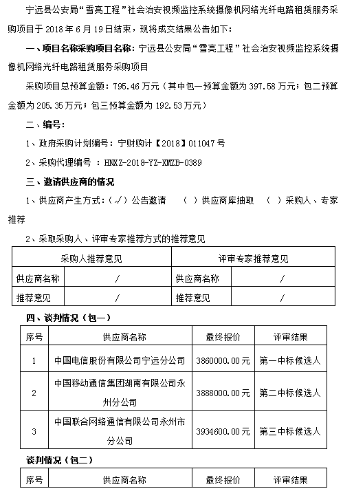 寧遠(yuǎn)縣公安局“雪亮工程”社會(huì)治安視頻監(jiān)控系統(tǒng) 攝像機(jī)網(wǎng)絡(luò)光纖電路租賃服務(wù)采購項(xiàng)目 競爭性談判成交結(jié)果公告