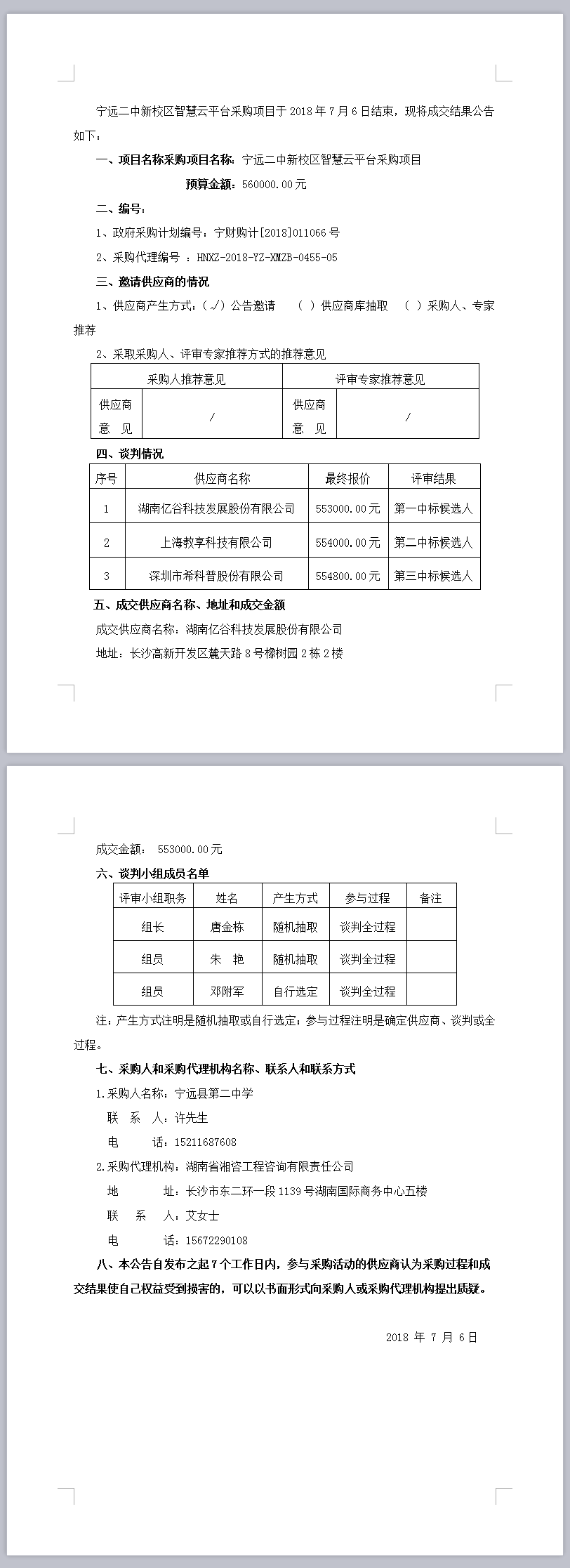 寧遠(yuǎn)二中新校區(qū)智慧云平臺采購項(xiàng)目競爭性談判成交結(jié)果公告