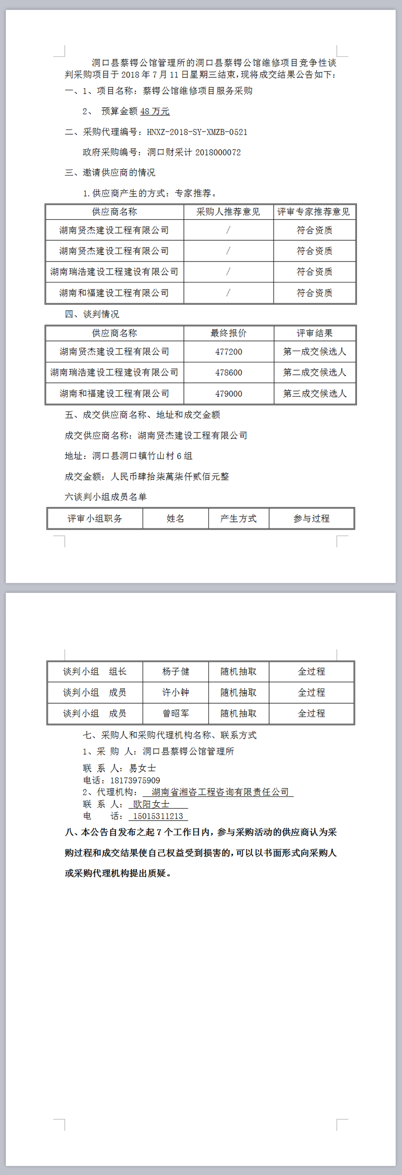 洞口縣蔡鍔公館管理所蔡鍔公館維修項(xiàng)目競(jìng)爭(zhēng)性談判成交公告