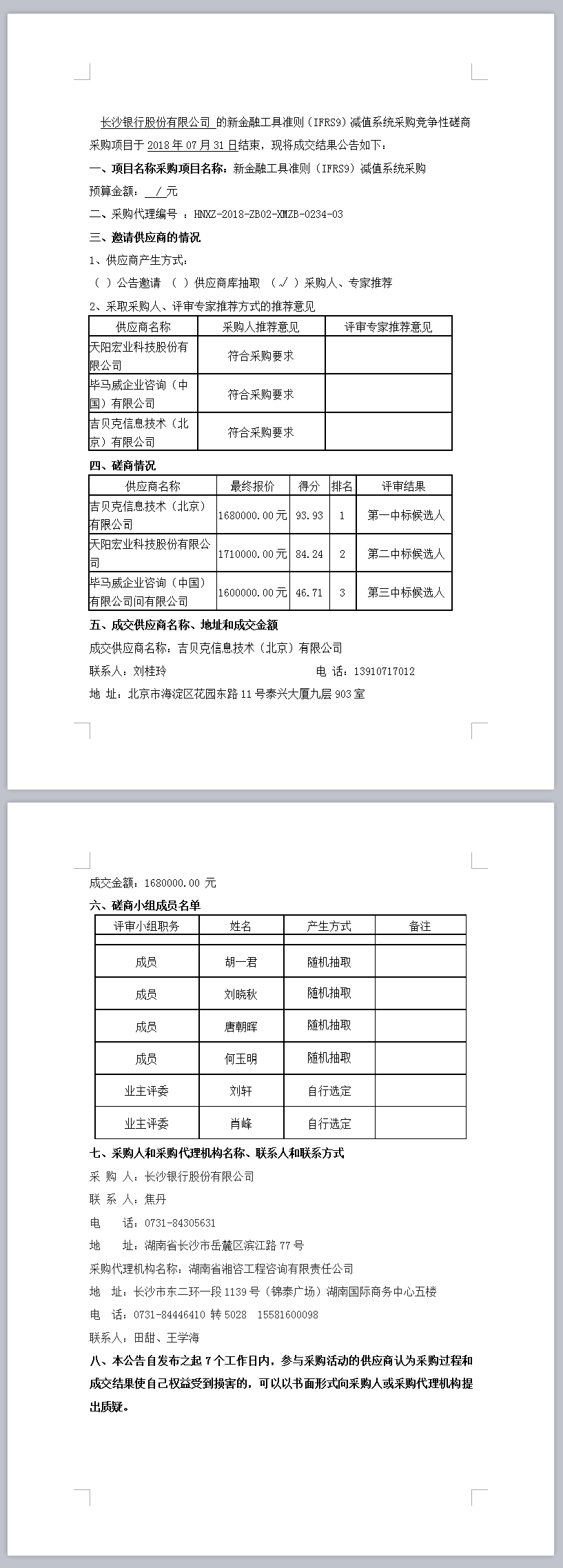 新金融工具準(zhǔn)則(IFRS9)減值系統(tǒng)采購(gòu)競(jìng)爭(zhēng)性磋商成交公告