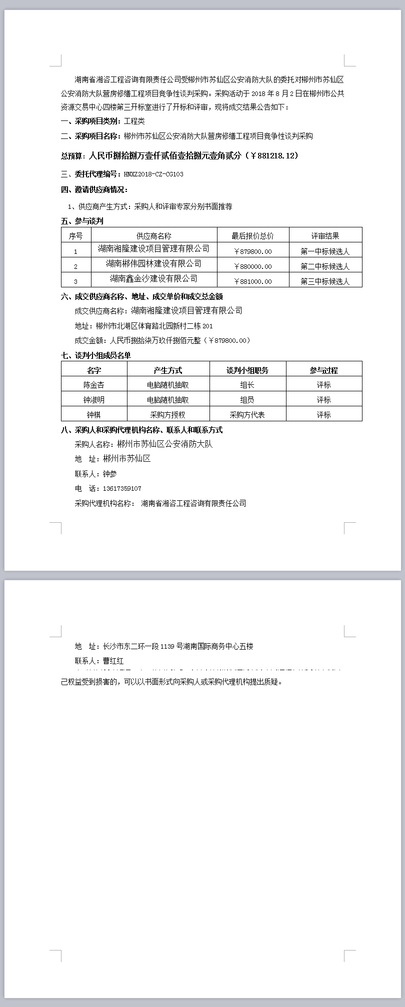 郴州市蘇仙區(qū)公安消防大隊(duì)營(yíng)房修繕工程項(xiàng)目競(jìng)爭(zhēng)性談判采購(gòu)成交公告