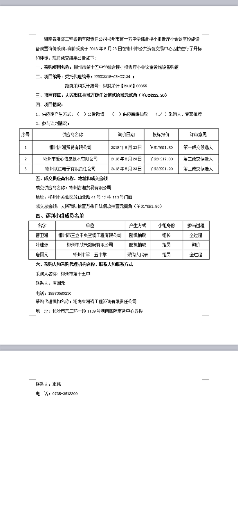 郴州市第十五中學(xué)綜合樓小報告廳小會議室設(shè)施設(shè)備購置詢價采購成交公告