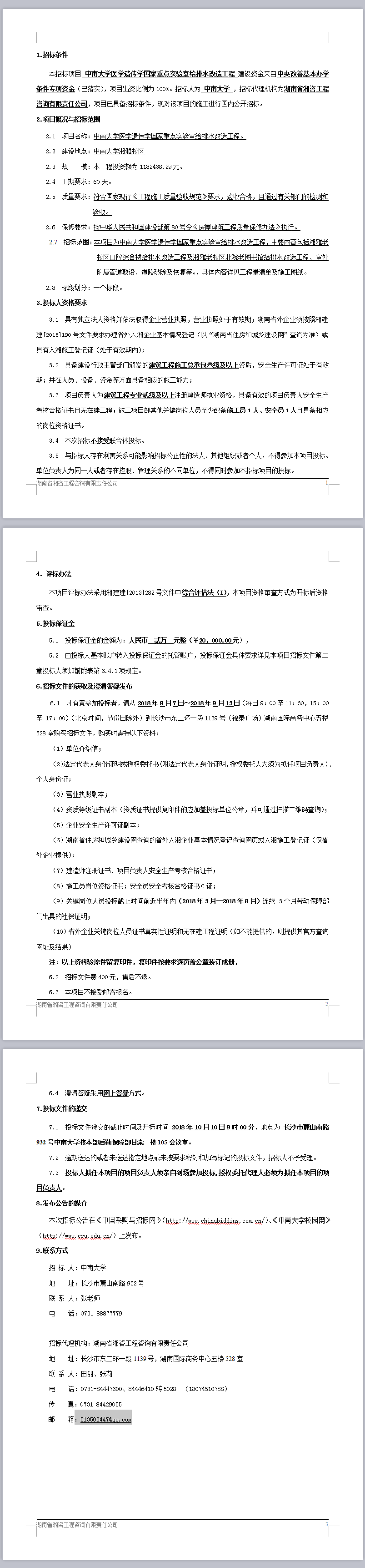 中南大學(xué)醫(yī)學(xué)遺傳學(xué)國家重點(diǎn)實(shí)驗(yàn)室給排水改造工程招標(biāo)公告
