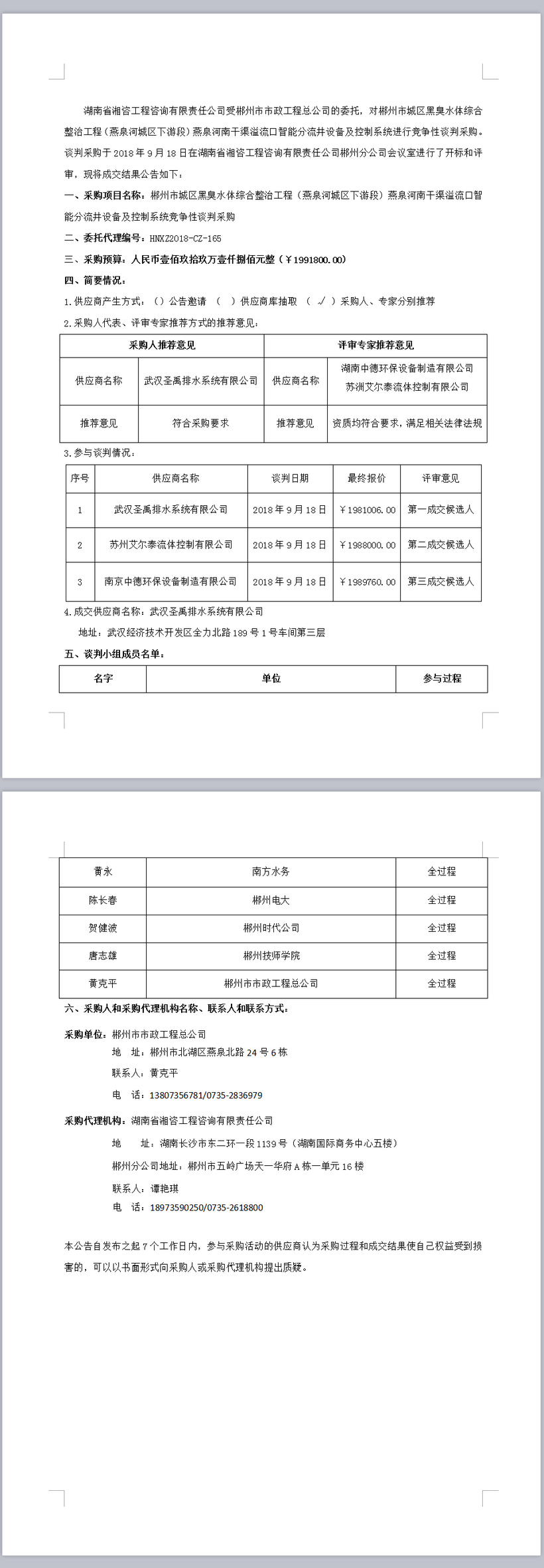 郴州市城區(qū)黑臭水體綜合整治工程(燕泉河城區(qū)下游段)燕泉河南干渠溢流口智能分流井設(shè)備及控制系統(tǒng)競爭性談判采購成交公告