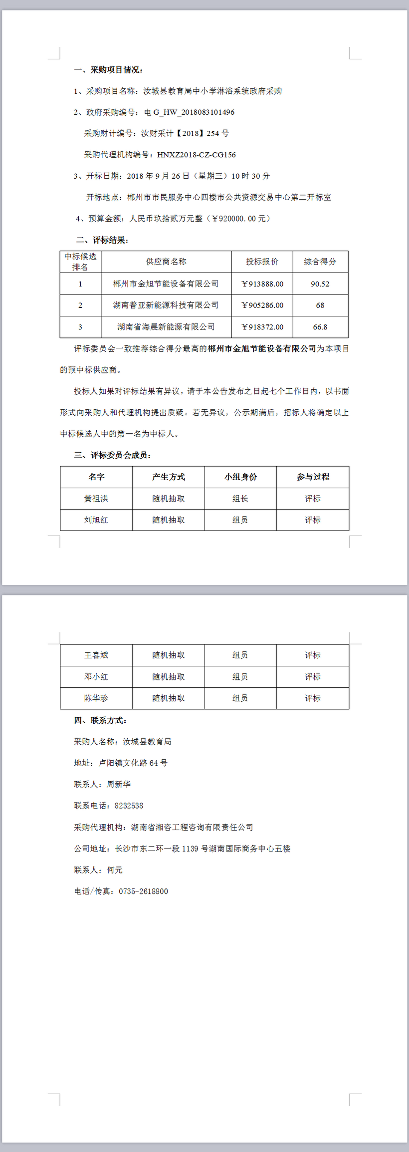 汝城縣教育局中小學淋浴系統(tǒng)政府采購中標結(jié)果公示
