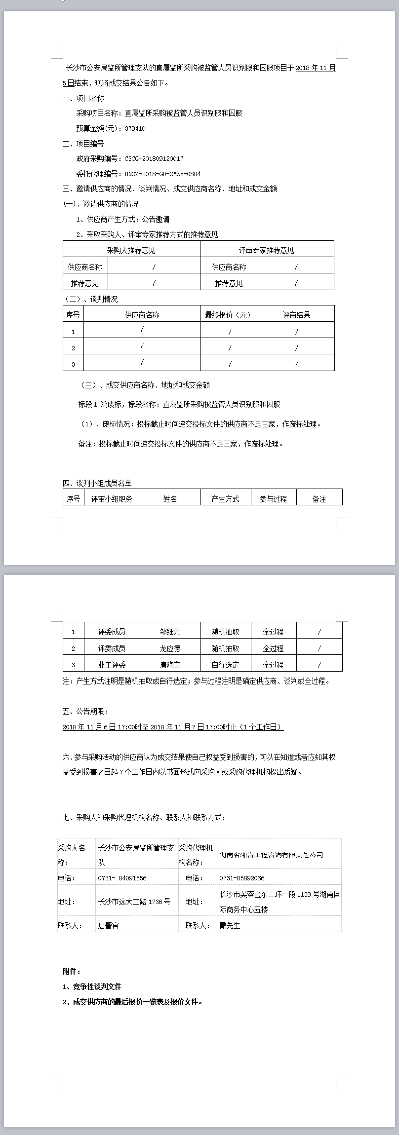長(zhǎng)沙市公安局監(jiān)所管理支隊(duì)直屬監(jiān)所采購(gòu)被監(jiān)管人員識(shí)別服和囚服結(jié)果公告