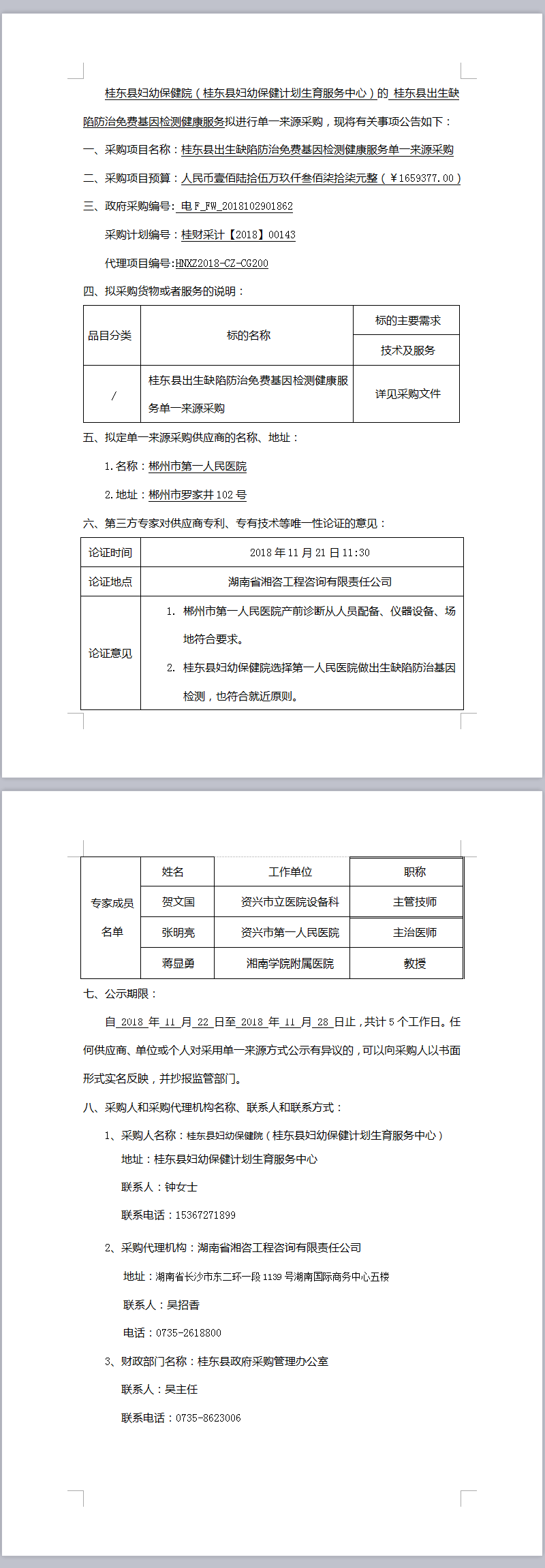 桂東縣出生缺陷防治免費(fèi)基因檢測(cè)健康服務(wù) 單一來(lái)源采購(gòu)公示