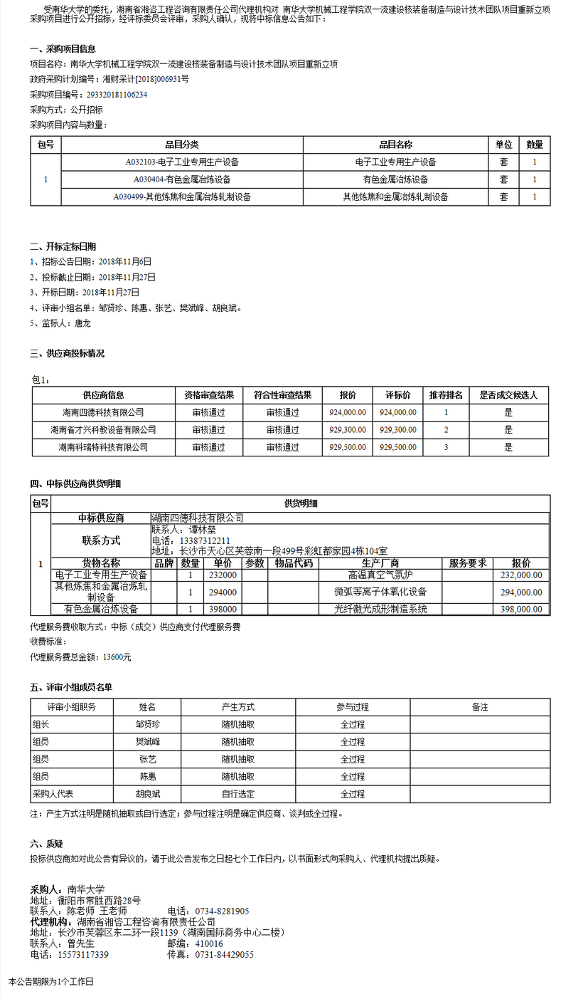 南華大學(xué)機(jī)械工程學(xué)院雙一流建設(shè)核裝備制造與設(shè)計技術(shù)團(tuán)隊項(xiàng)目重新立項(xiàng)公開招標(biāo)中標(biāo)公告