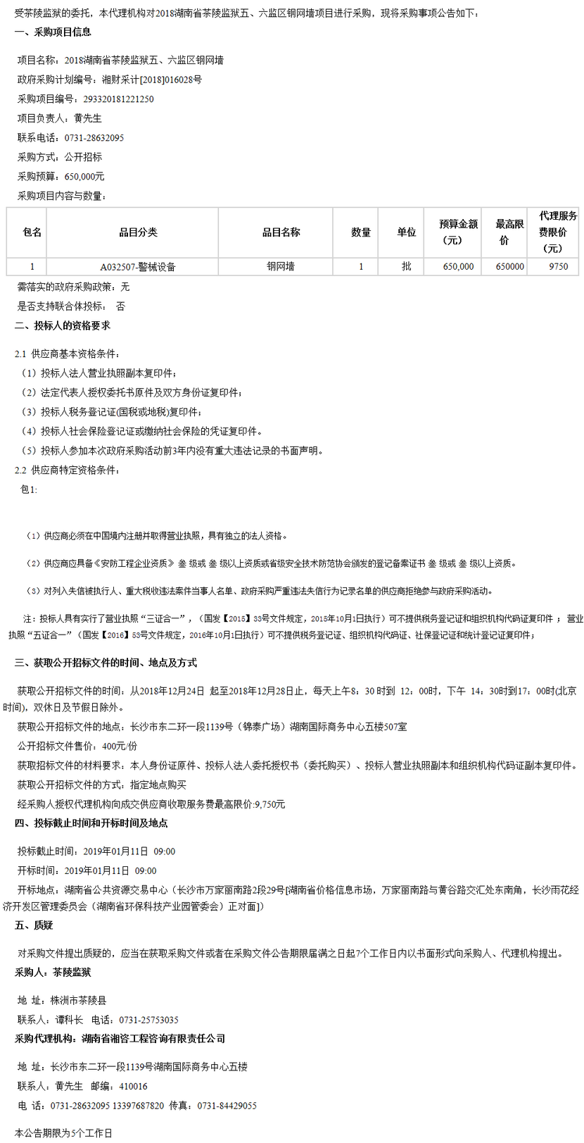 2018湖南省茶陵監(jiān)獄五、六監(jiān)區(qū)鋼網(wǎng)墻投標(biāo)邀請