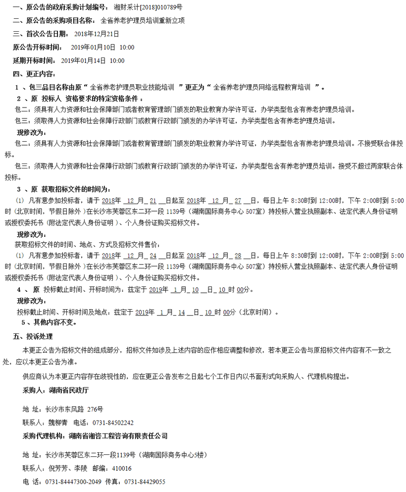 湖南省民政廳全省養(yǎng)老護(hù)理員培訓(xùn)重新立項項目公開招標(biāo)更正公告