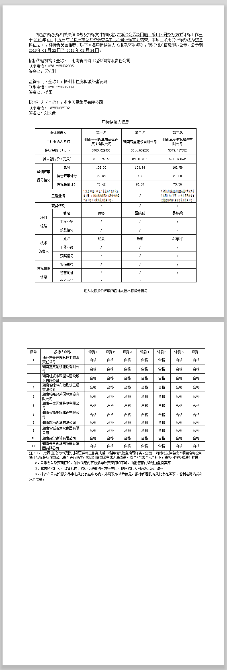 浣溪沙公園項目施工招標(biāo)投標(biāo)信息公示表