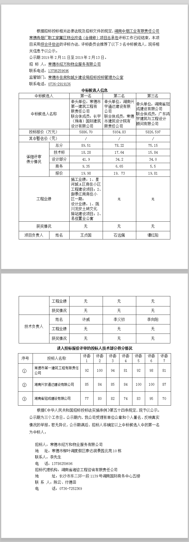 湖南中煙工業(yè)有限責任公司常德卷煙廠職工家屬區(qū)物業(yè)改造(含維修)項目總承包中標候選人公示