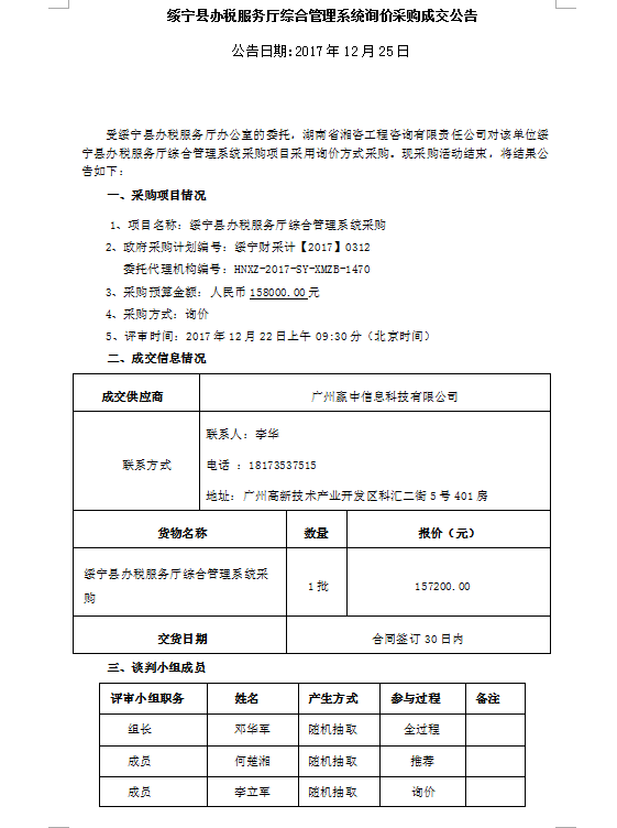 綏寧縣辦稅服務廳綜合管理系統(tǒng)詢價采購成交公告