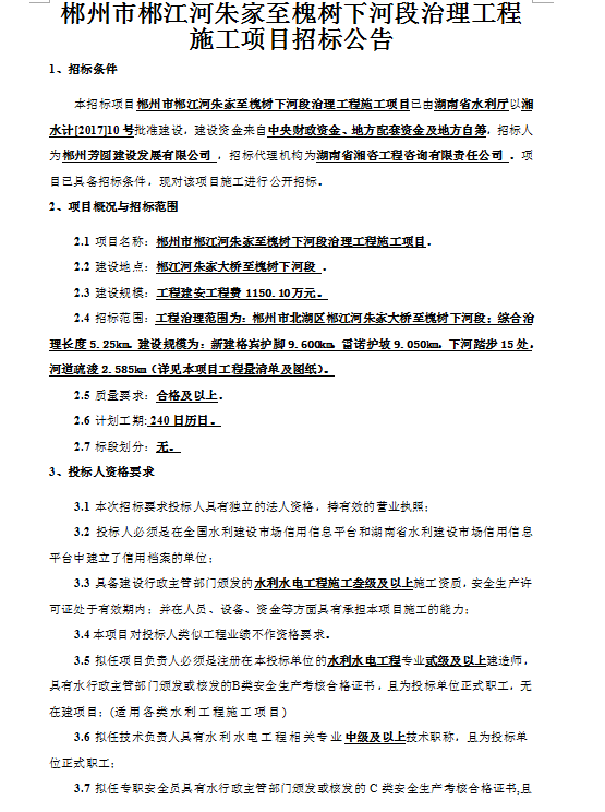 郴州市郴江河朱家至槐樹下河段治理工程施工項目招標(biāo)公告