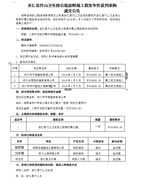 安仁縣竹山衛(wèi)生院公租房附屬工程競爭性談判采購 成交公告