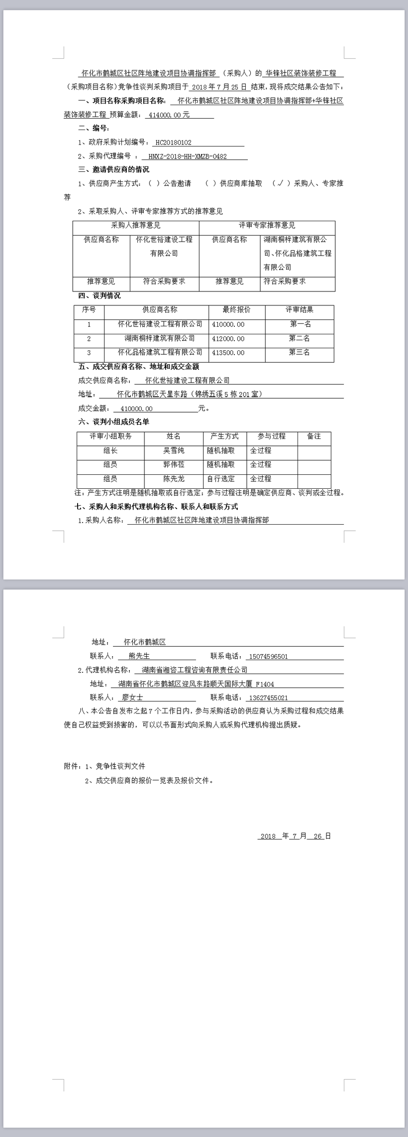 懷化市鶴城區(qū)社區(qū)陣地建設(shè)項(xiàng)目協(xié)調(diào)指揮部+華鋒社區(qū)裝飾裝修工程競(jìng)爭(zhēng)性談判成交結(jié)果公告