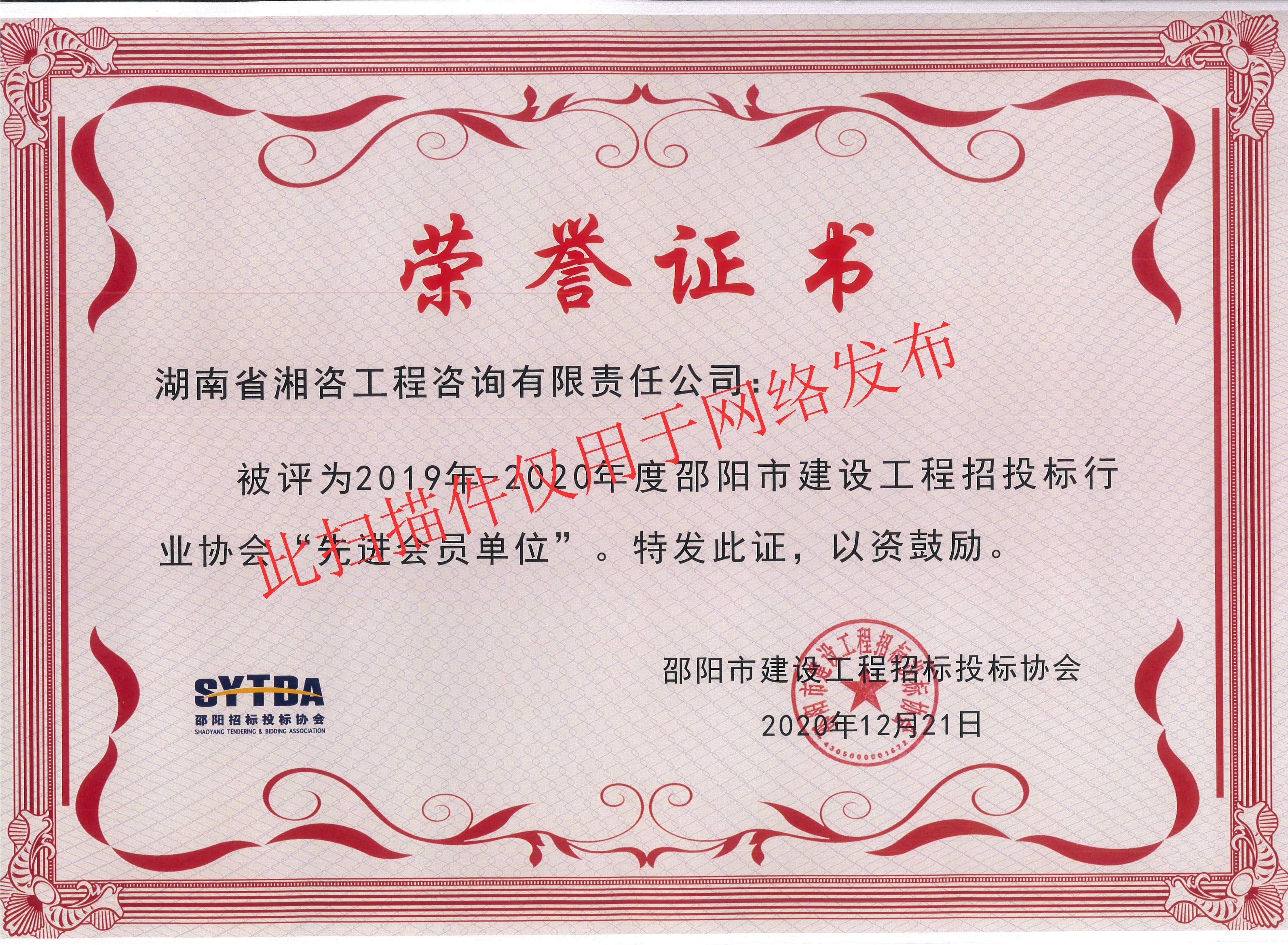 【喜訊】熱烈慶祝我司被評為2019年-2020年度邵陽市建設(shè)工程招標(biāo)投標(biāo)行業(yè)協(xié)會“先進(jìn)會員單位”。特發(fā)此證,以資鼓勵