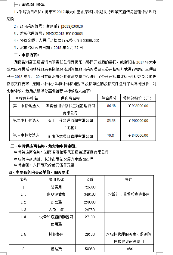 衡陽市2017年大中型水庫移民后期扶持政策實施情況監(jiān)測評估政府采購中標公告