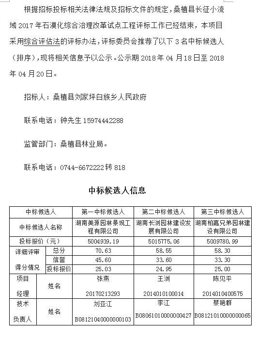 桑植縣長征小流域2017年石漠化綜合治理改革試點工程中標候選人公示