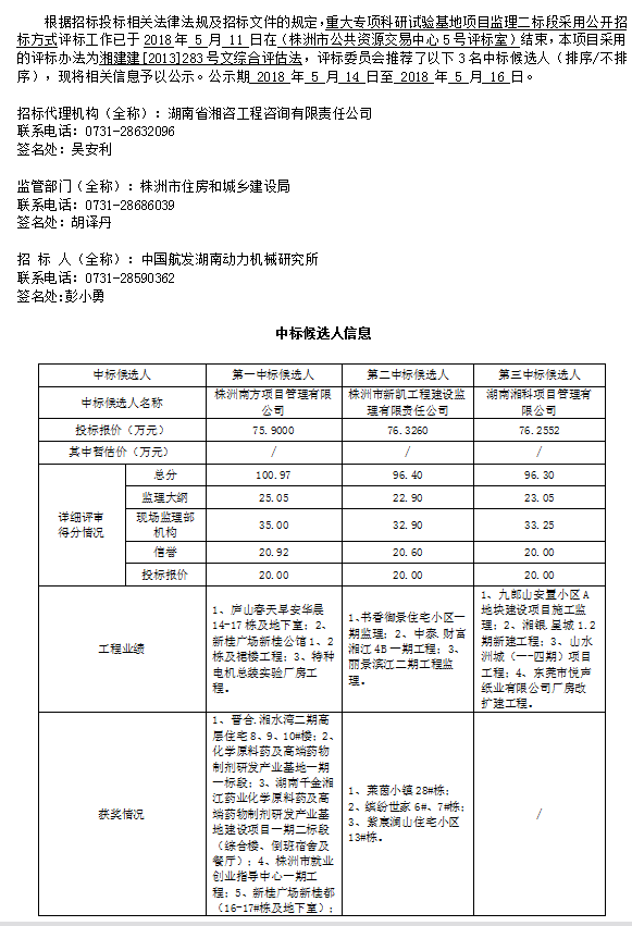 重大專項(xiàng)科研試驗(yàn)基地項(xiàng)目監(jiān)理二標(biāo)段 招標(biāo)投標(biāo)信息公示表